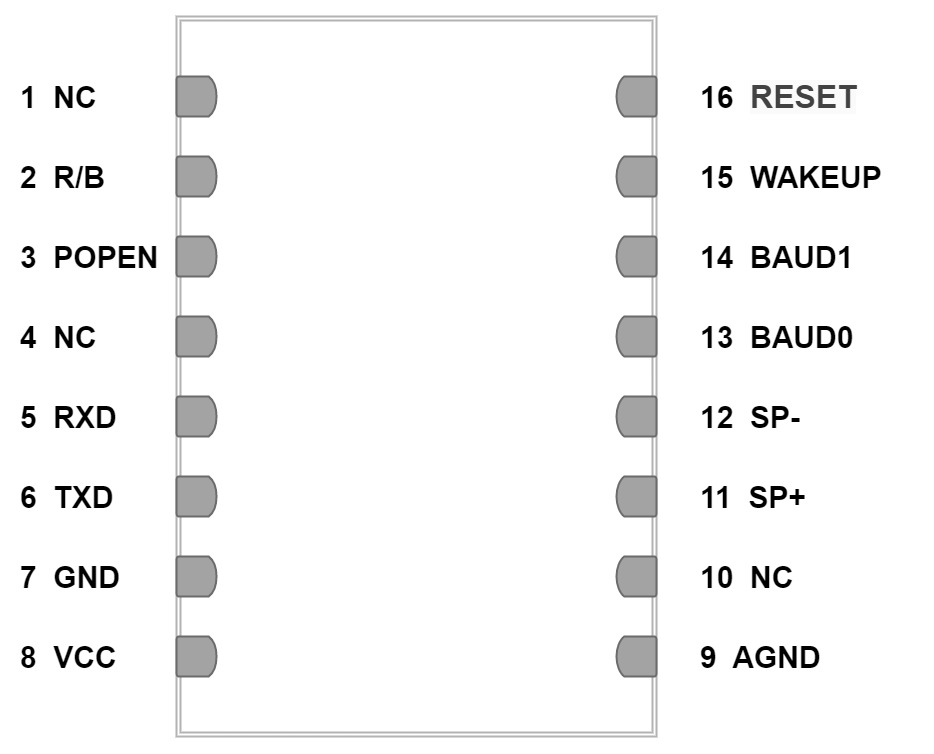 | 1 | NC | 不接 | 16 | RESET | 复位脚(保持1秒以上低电平复位) | |