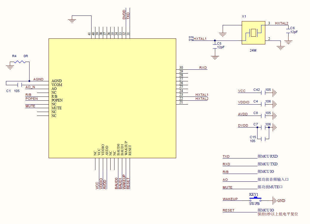晶振应尽量靠近本芯片的XTAL24MI和XTAL24MI管脚放置,遵循距离最短、走线宽、走线包地原则。同时,晶振的谐振电容应紧靠其两侧。