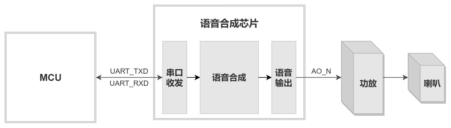 主控制器和语音合成芯片之间通过UART 接口连接,控制器可通过通讯接口向语音合成芯片发送控制命令和文本,语音合成芯片把接收到的文本合成为语音信号输出,输出的信号经功率放大器进行放大后连接到喇叭进行播放。