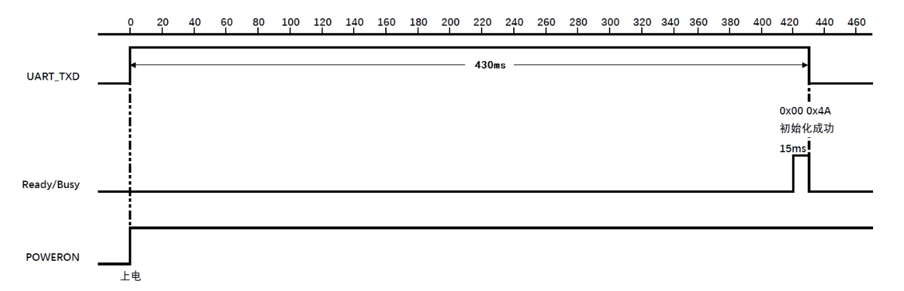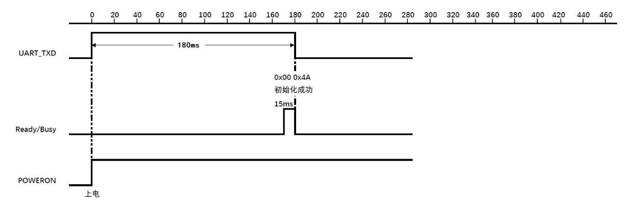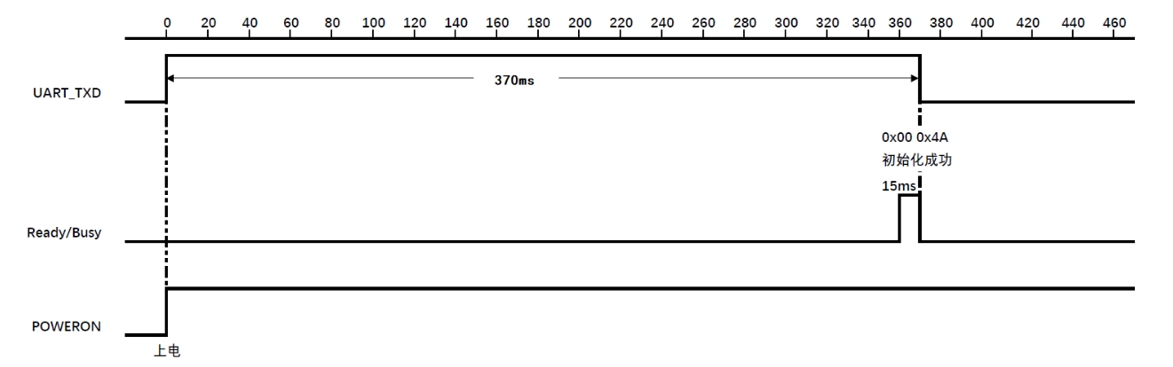 芯片启动或复位后,大约N毫秒后UART口会返回0x4A回传(回传只要包含0x4A即可,例如:0x00 0x4A 或 0x00 0x34 0x4A 或 0xF0 0x4A),代表“初始化成功”,此时用户可以发送命令控制芯片。