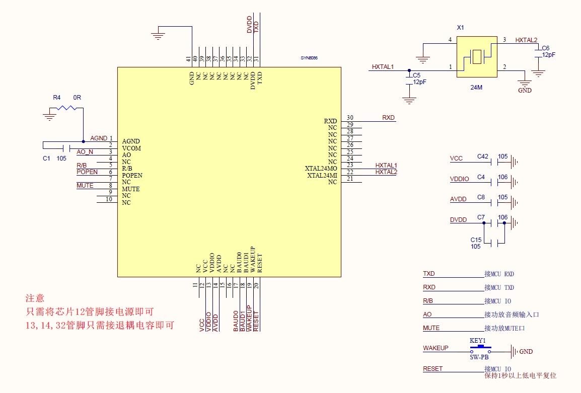 晶振应尽量靠近本芯片的XTAL24MI和XTAL24MI管脚放置,遵循距离最短、走线宽、走线包地原则。同时,晶振的谐振电容应紧靠其两侧。